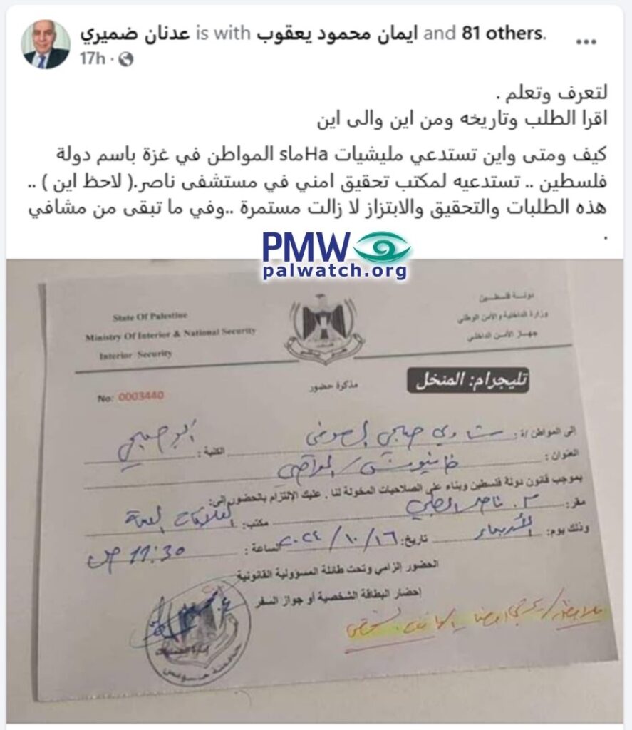 Wie von Palestinian Media Watch schon berichtet, hat die Hamas aus dem Nasser-Krankenhaus ein Zentrum für Verhöre und Zwangsmaßnahmen gemacht. Im Oktober 2024 lud, wie die palästinensische Autonomiebehörde auf Facebook selbst zugab, die Hamas über ihren Militärgeheimdienst Gazaner zu Verhören ins Nasser-Krankenhaus vor. Shadi Subhi Al-Suweiti wurde befohlen, mit der unten gezeigten Vorladung „nach dem Gesetz des Staates Palästina und in Übereinstimmung mit der uns übertragenen Autorität“ aufgefordert „sich in den Räumlichkeiten des Nasser Medical Centers einzufinden“.