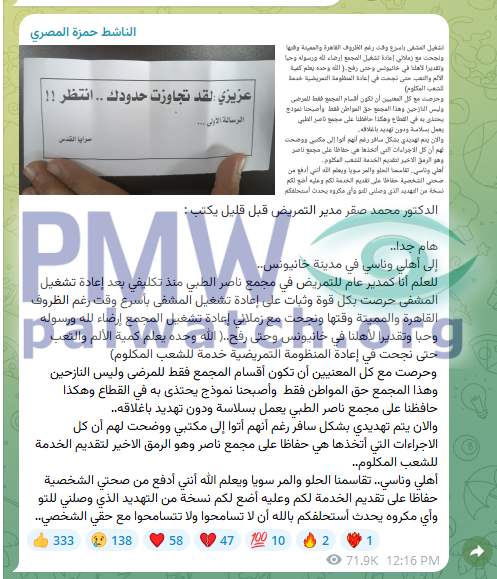 In dem unten gezeigten Telegram-Post im April 2025 zeigte der Pflegedienstleiter des Krankenhauses eine Notiz, mit der er vom Islamischen Jihad „unverhohlen bedroht“ wurde, weil er versuchte zu verhindern, dass die Organisation sich dort verschanzt: „Süßer. Du hast die Grenze überschritten – warte ab! Das ist die erste Nachricht. Al-Quds-Brigaden.“
