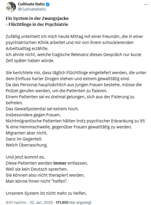 Hier ein Tatsachenbericht darüber, was in den Psychiatrien mittlerweile abgeht und wie überfordert sie mit dieser neuen Art von „Patienten“ sind: