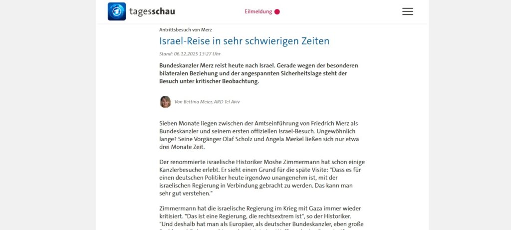 Der Israel-Besuch des deutschen Bundeskanzlers ist ein seltenes politisches Ereignis. Noch seltener aber ist eine Berichterstattung, die der gesamten Komplexität dieses Landes gerecht wird. Der jüngste ARD-Artikel versucht, die Reise einzuordnen – und erzeugt dabei ein vertrautes Muster: Israel erscheint als moralisches und politisches Risiko, während die Bedrohung, der das Land ausgesetzt ist, kaum ein Wort erhält. Nicht durch plumpe Anklage, sondern durch Auswahl, Gewichtung und Auslassung entsteht ein Bild, das mit der Realität vor Ort nur teilweise zu tun hat.