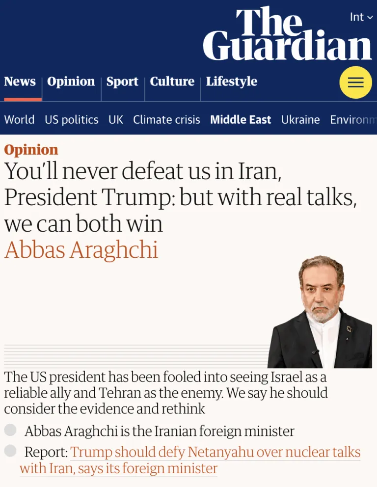 In der vergangenen Woche veröffentlichte der Guardian sogar einen Gastbeitrag des iranischen Außenministers Abbas Araghchi unter der Überschrift: „You’ll never defeat us in Iran, President Trump: but with real talks, we can both win.“ [Du wirst uns im Iran niemals besiegen, Präsident Trump: aber mit echten Gesprächen werden wir beide gewinnnen.]