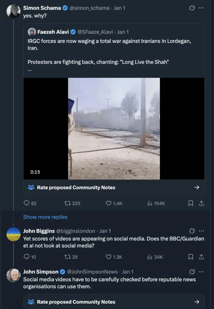 Dort, wo BBC Verify die „Verifizierung“ vorgenommen hat, die John Simpson als so schwierig bezeichnete, geriet die Redaktion in die Kritik: Sie konzentrierte sich darauf, vereinzelte Fälle von KI-generierten Bildern zu entkräften – statt das überwältigende Ausmaß echten Materials anzuerkennen, das die Brutalität gegen Demonstrierende dokumentiert.