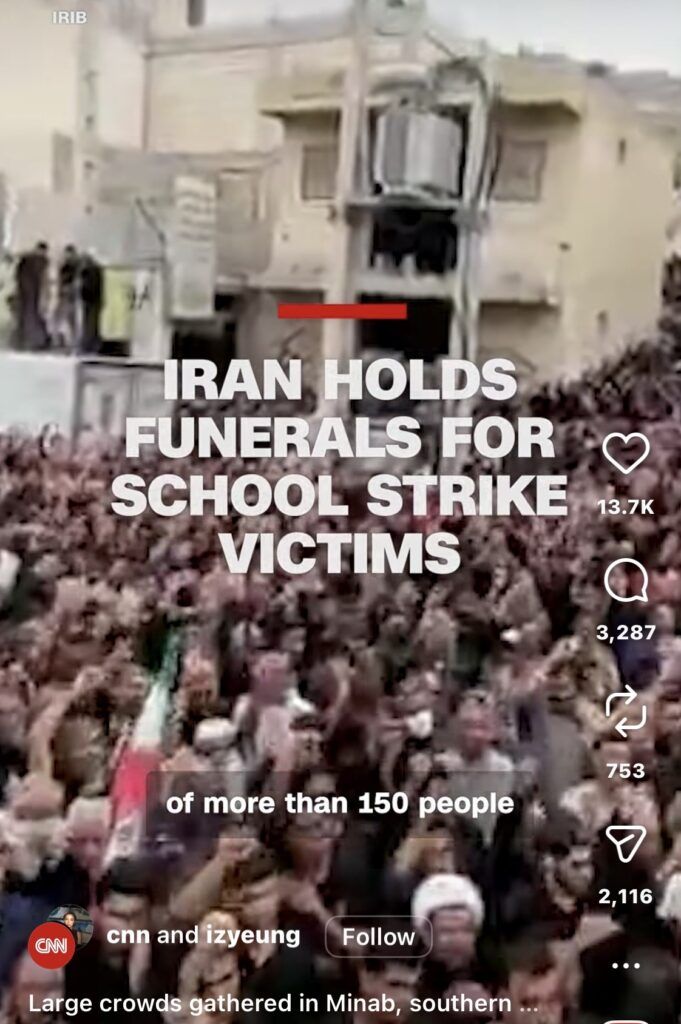 Zahlen statt Beweise: Ein CNN-Bericht behauptet, Iran halte Beerdigungen für Opfer des Schulstreiks ab, wobei von „mehr als 150“ Toten die Rede ist. Das ist ein klassisches Beispiel für Asymmetrie. In anderen Kontexten (wie etwa einem israelischen Militärschlag) würden die Medien vermutlich eine unabhängige Überprüfung fordern, bevor sie eine so hohe Zahl in einer Schlagzeile veröffentlichen.